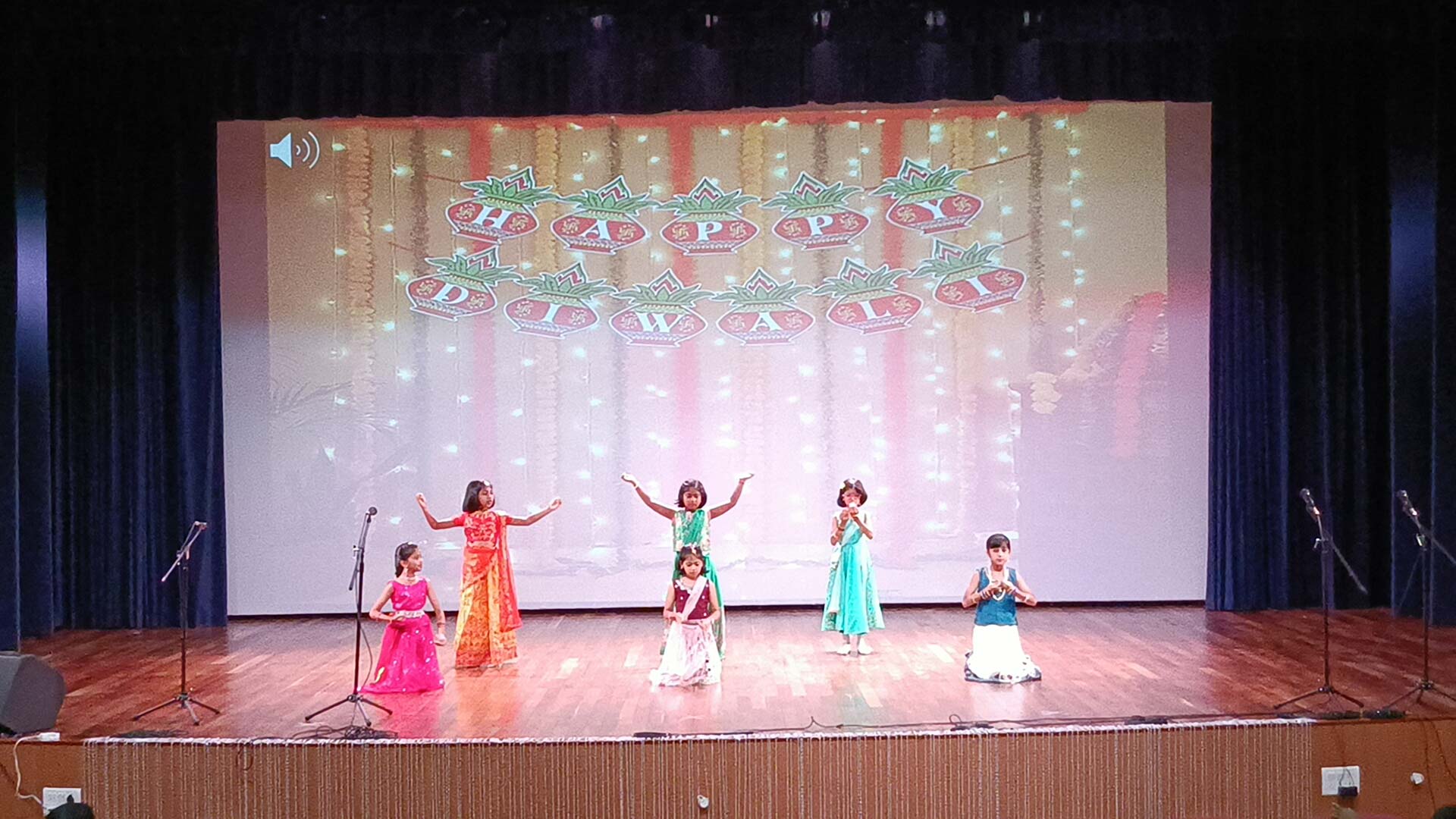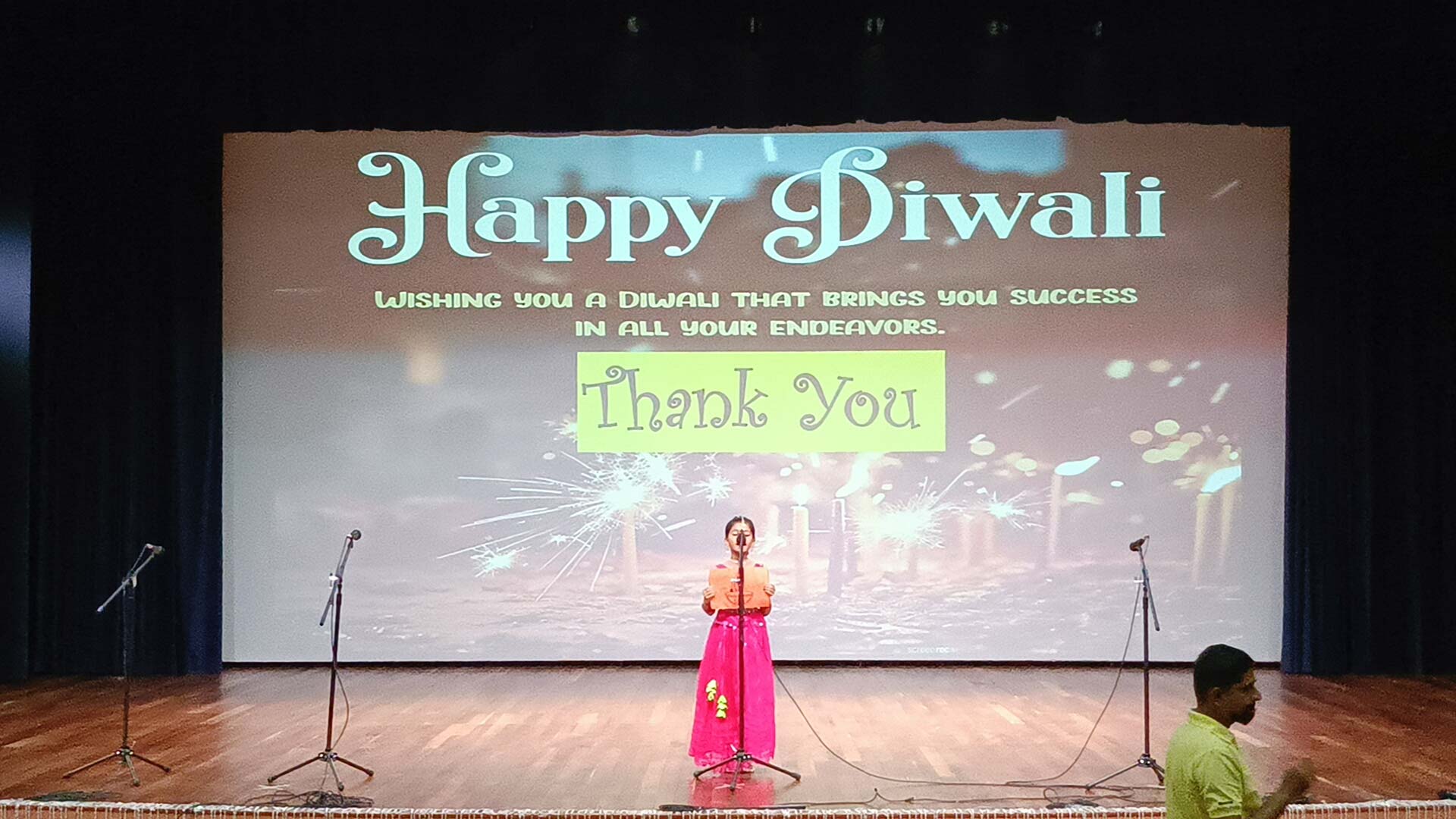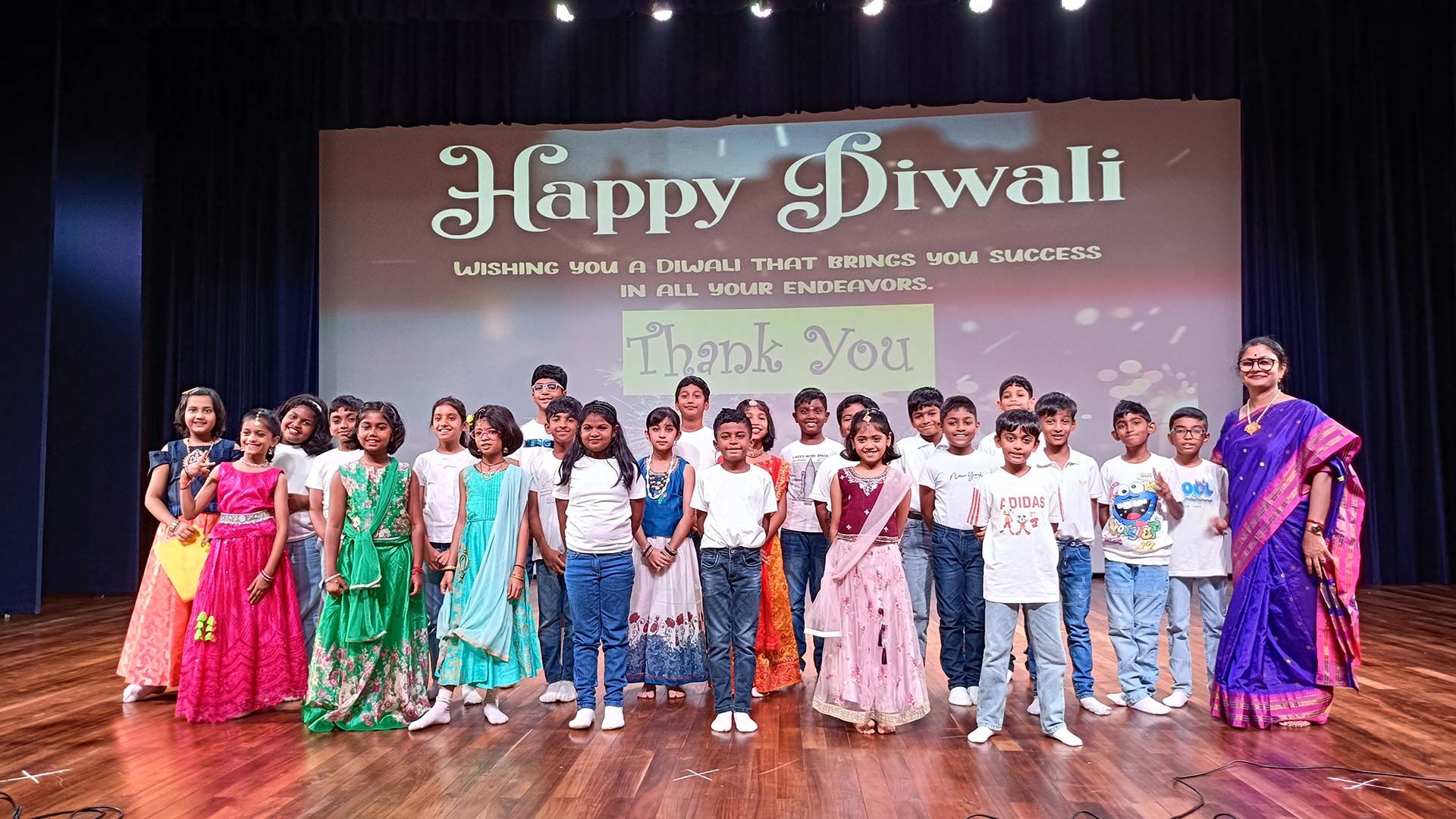 The presentation concluded with a teacher sharing words of appreciation for the students' hard work. She reminded everyone to carry forward the message of Diwali throughout the year by spreading love, light, and positivity in every situation.