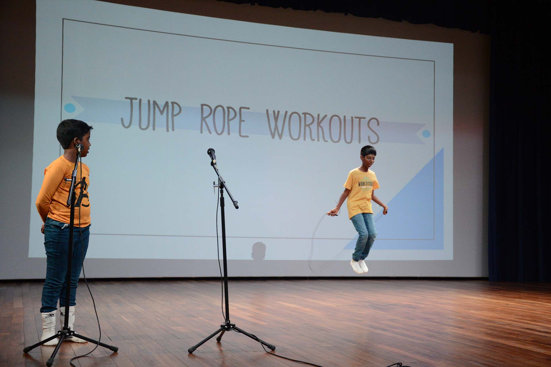 Two yoga asanas—Tadasana and Triyak Tadasana were demonstrated by students. These poses were selected for their simplicity and effectiveness in promoting physical stability and flexibility. Additionally, the students demonstrated jump rope exercises, reinforcing the idea that outdoor activities are vital for staying fit, healthy and happy.