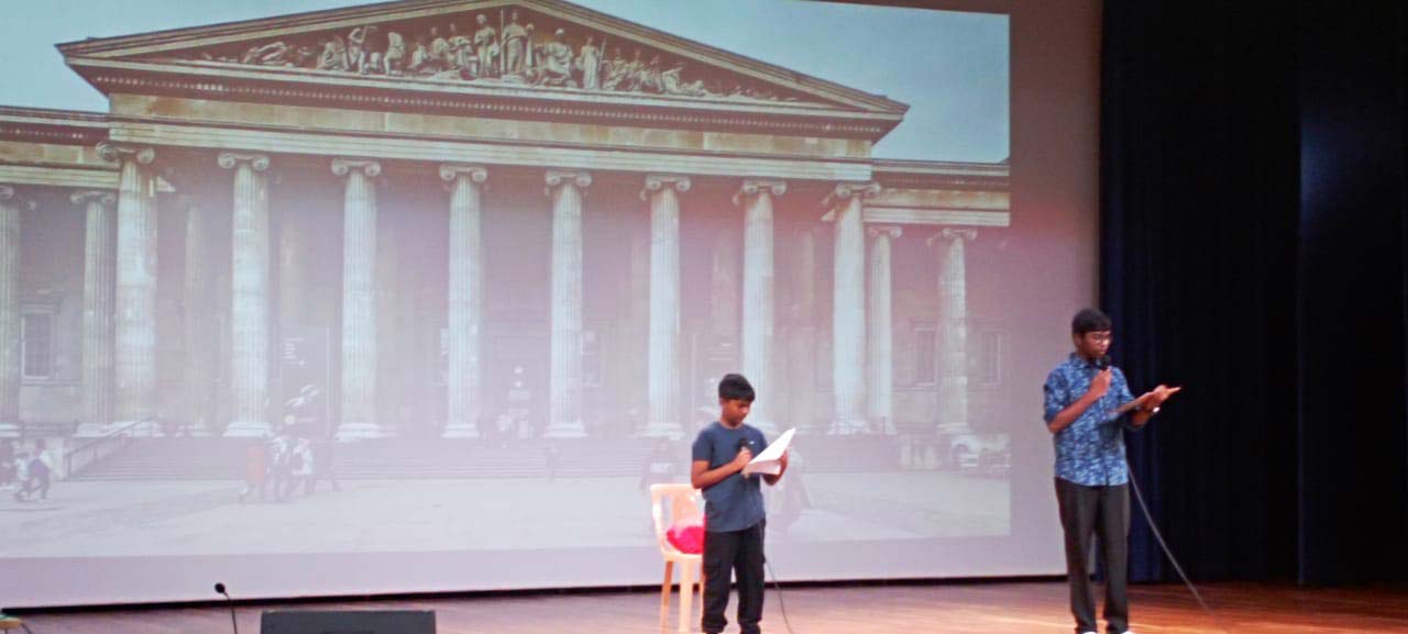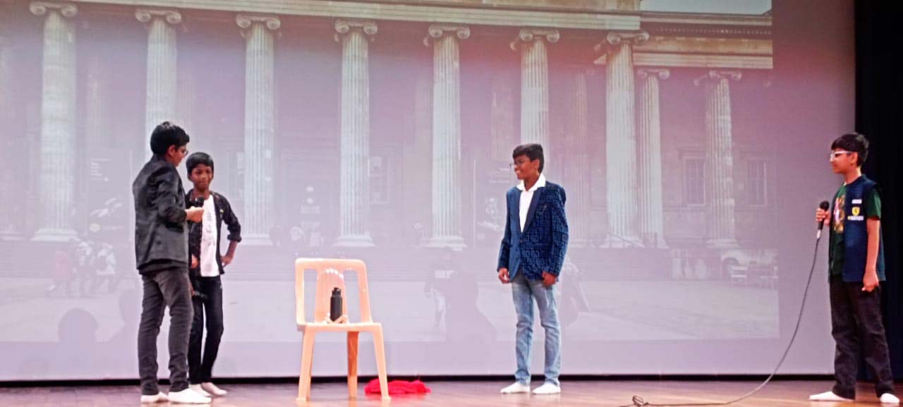 The assembly ended with a twist wherein the skit resumed. The Museum Manager thanked the detectives for solving the case and finding the precious diamond without which he would have been sacked from his job. To everyone’s surprise, when he lifted the red cloth, the diamond was not there. The third thief, who had escaped the Investigation Bureau Team, was seen gliding across the stage with an evil laugh.