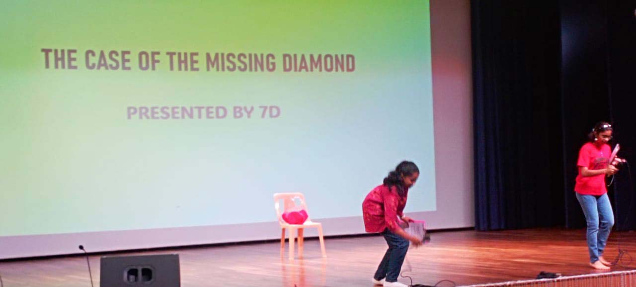 The students of grade 7D took to the stage to put up an exciting show featuring the theme: Mystery. The crux of the program was contained in the skit titled "The Case of the Missing Diamond," a thrilling story that had the audience glued to their seats. The plot revolved around a shining blue diamond that was to be unveiled at the 7D Museum. However, just as the Museum Manager lifts the red satin cloth, the mystery unfolds – the diamond was gone.