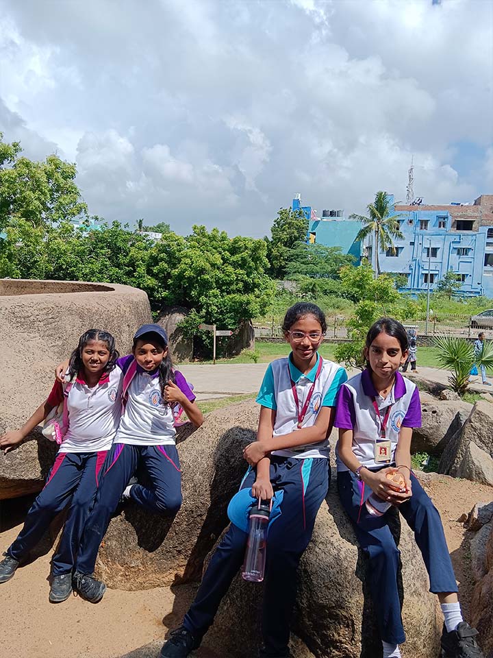 The students of Grade 6 went on an exciting educational trip to Mahabalipuram, a UNESCO World Heritage site, where history came alive through magnificent monuments and the scenic coastal setting. The journey was filled with enthusiasm as students explored the rich cultural heritage of the Pallava dynasty.