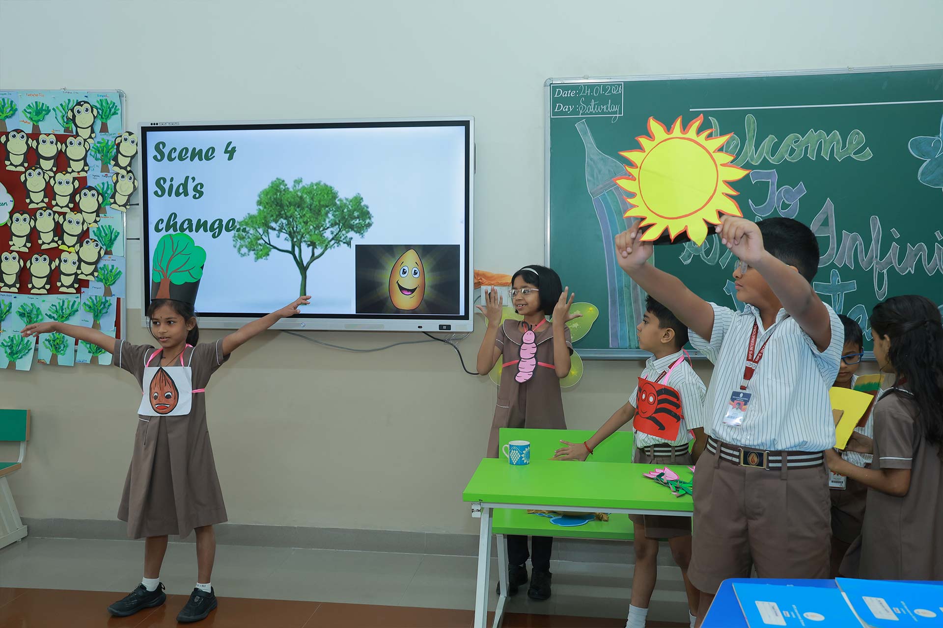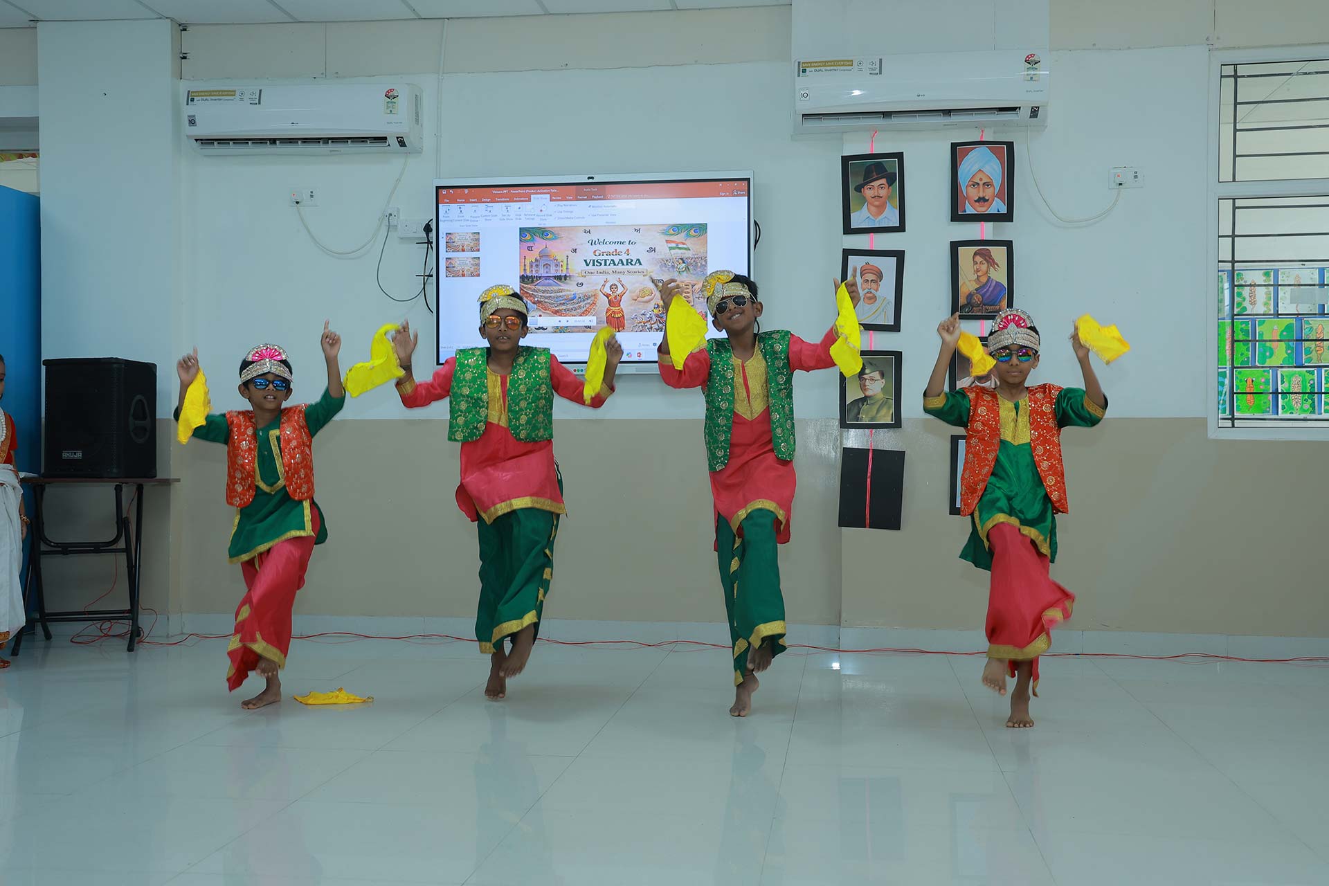 Grade 4 students from all sections collaborated seamlessly to present six thematic counters celebrating One India, Many Stories. Echoes of India saw students confidently explaining iconic monuments using symbolic passports. At Woven Wonders, students showcased regional fabrics and engaged parents in hands-on block printing. Motifs and Masterpieces highlighted traditional art forms, inviting parents to create Warli and Pichwai drawings. Soil to Sacrifice featured students speaking about diverse food grains and famous regional dishes, while also bringing alive stories of lesser-known Indian freedom fighters through enactments and interactions with parents. Games that Grew Generations revived traditional games with active parent participation, and Books Beyond Borders celebrated linguistic diversity as students presented parents with cute, handwritten thank-you notes in various Indian languages. A vibrant classical and folk dance performance beautifully reinforced India’s unity in diversity.