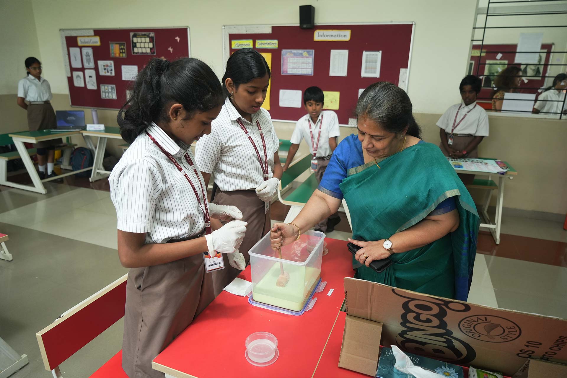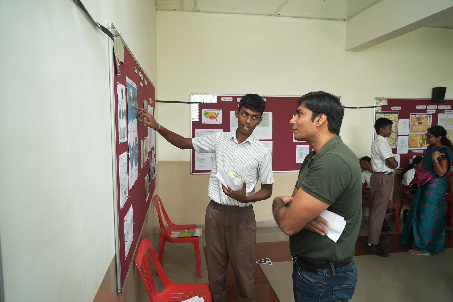 In History and Civics, students explored climate change through historical perspectives such as Krishnadevaraya’s court and the findings from Keezhadi, highlighting sustainable practices and environmental responsibility. Geography presentations focused on mapping through time, AI, GIS, and career opportunities, with hands-on activities using scientific instruments that captured parents’ interest.