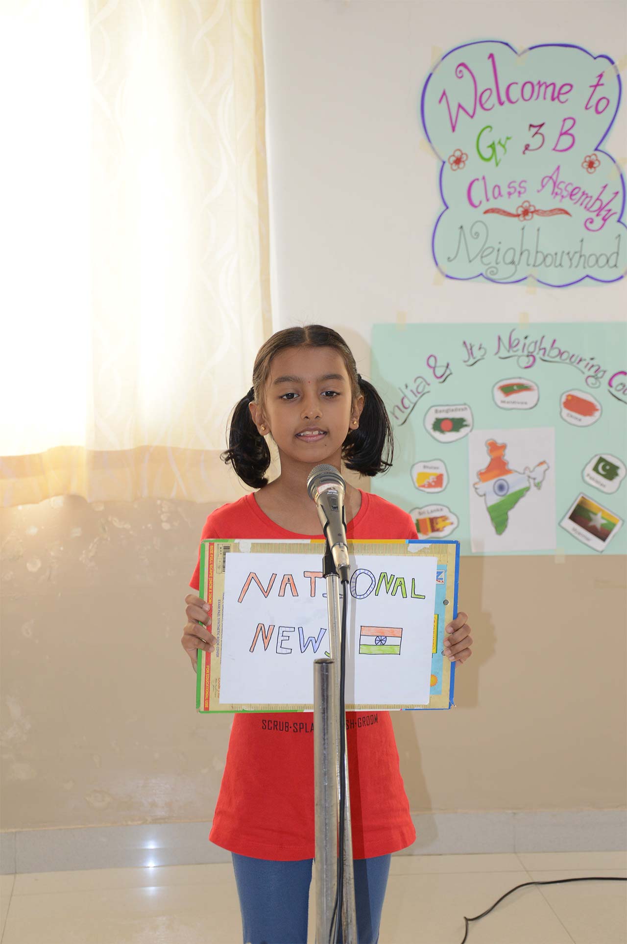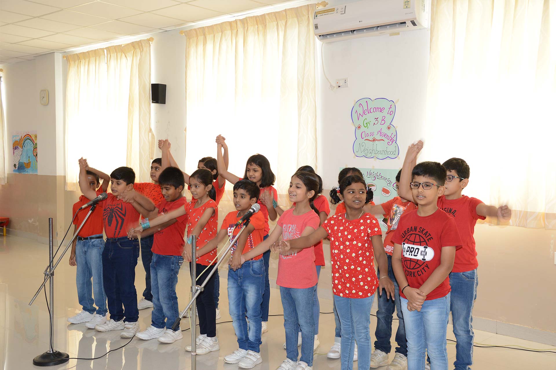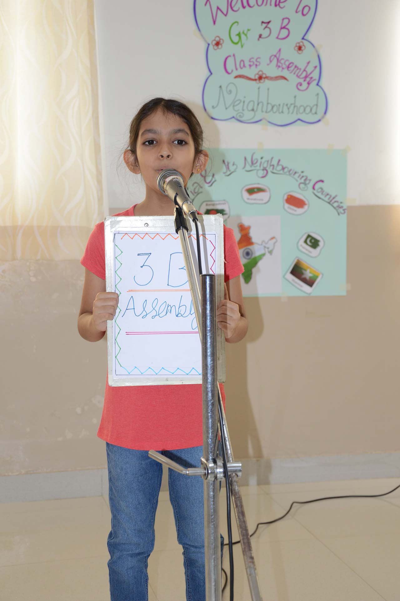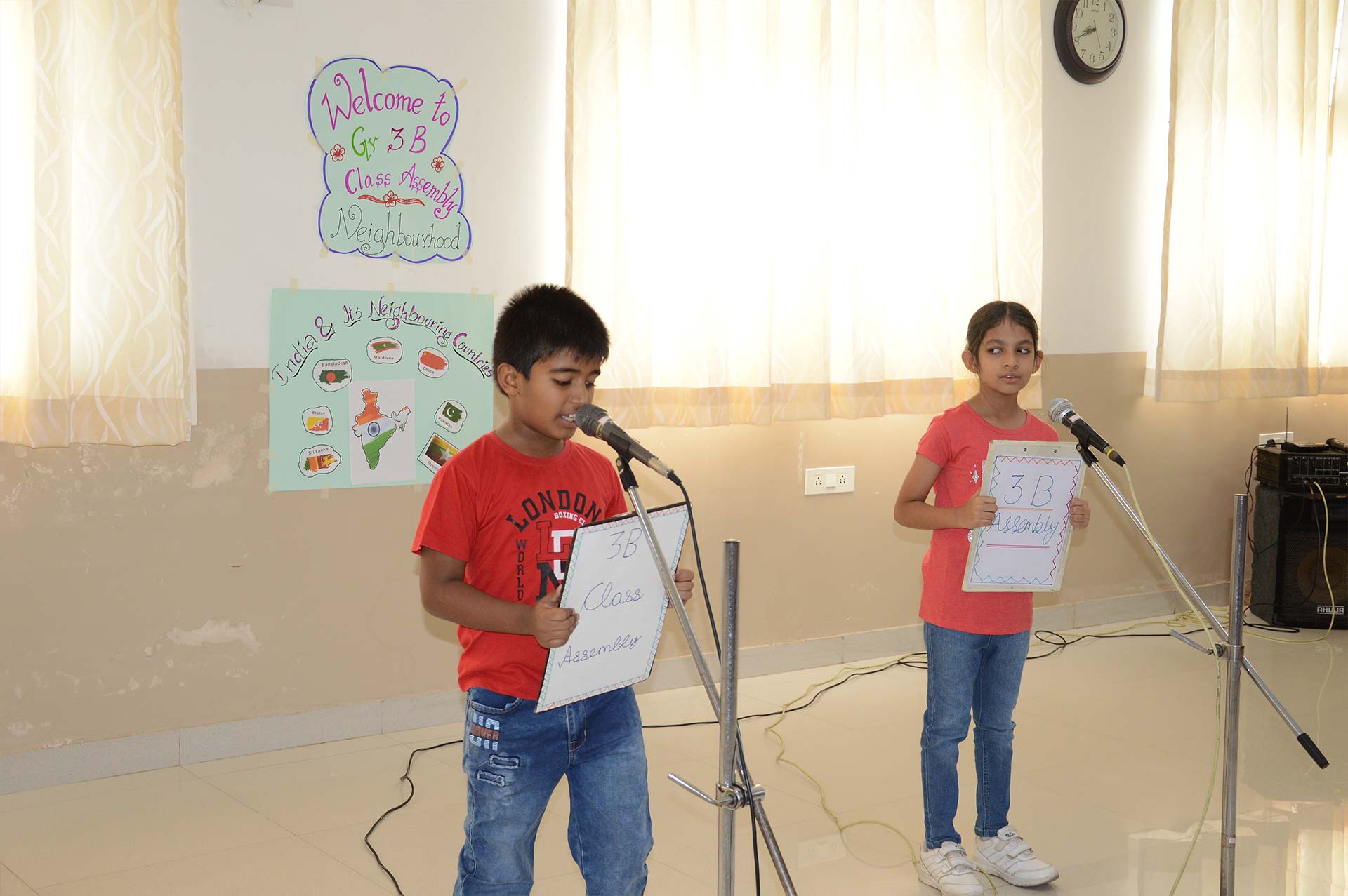 The students of 3B presented their class assembly on the topic, Neighbourhood. The students exhibited their dynamism by doubling up and playing multiple roles throughout the show.