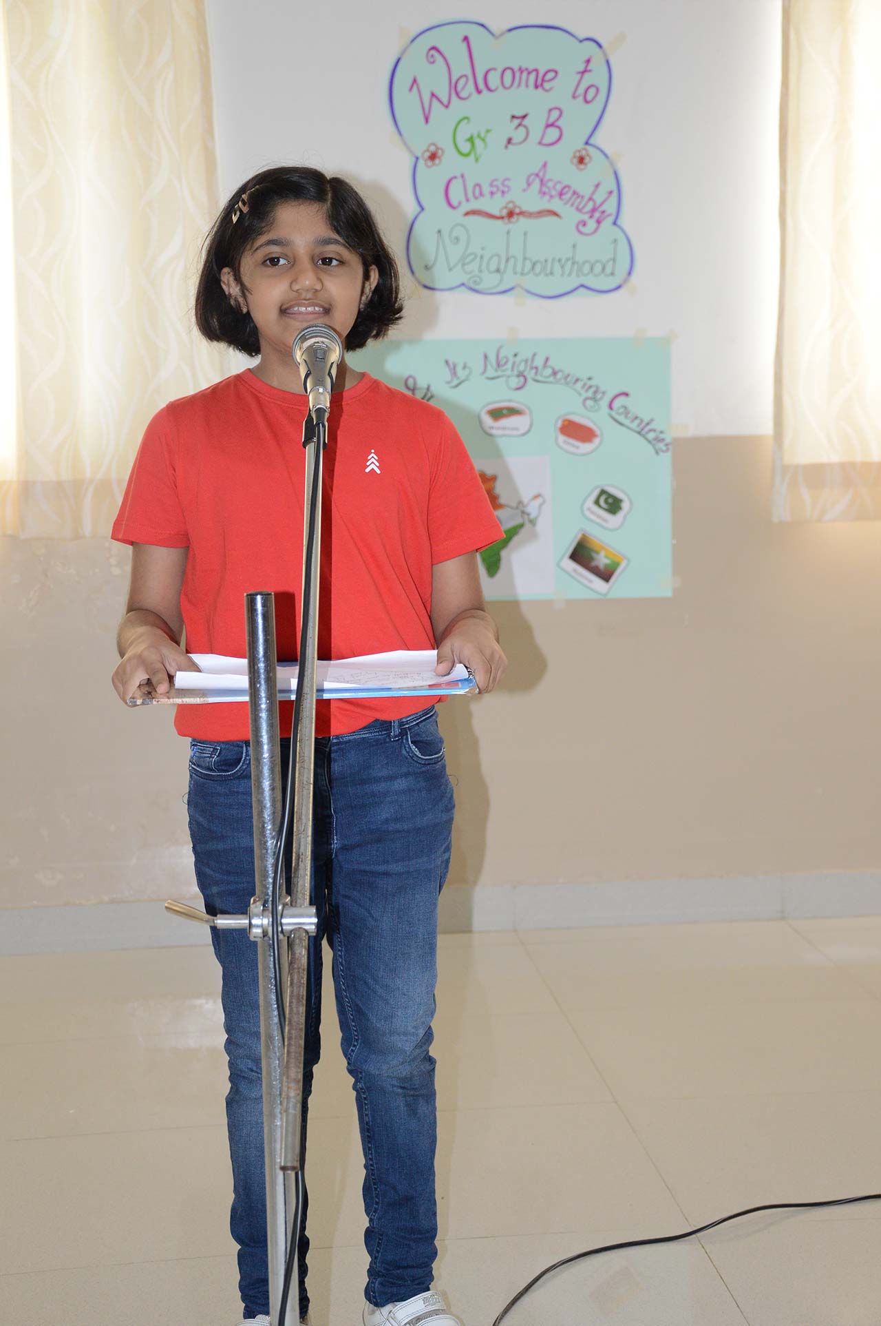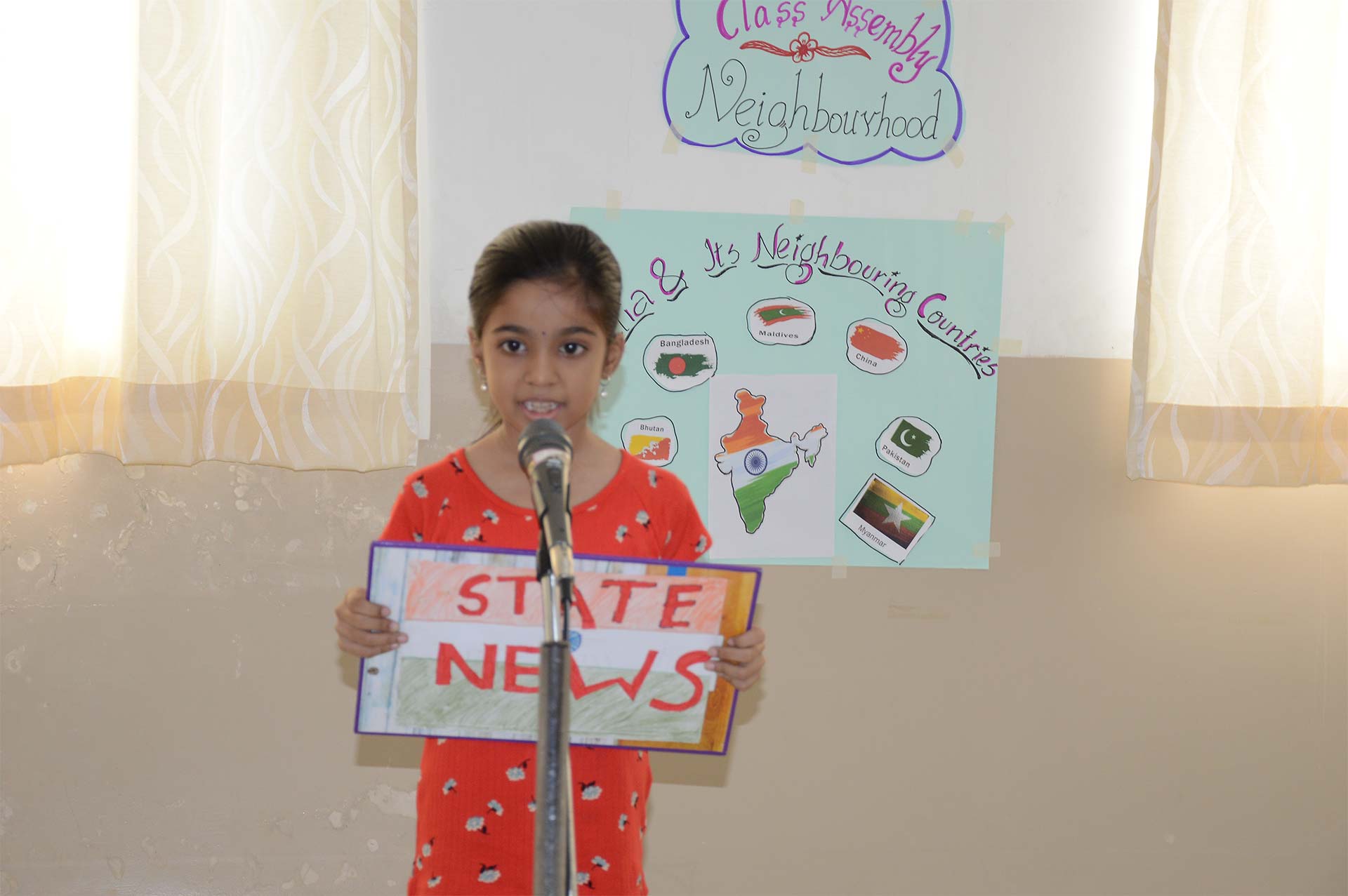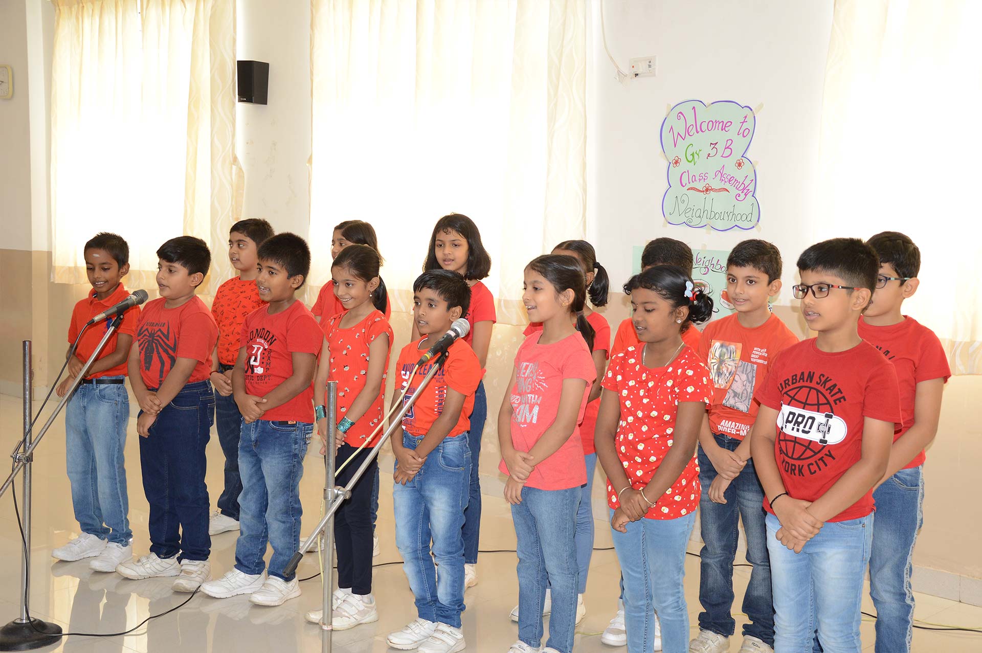 The students of 3B presented their class assembly on the topic, Neighbourhood. The students exhibited their dynamism by doubling up and playing multiple roles throughout the show.