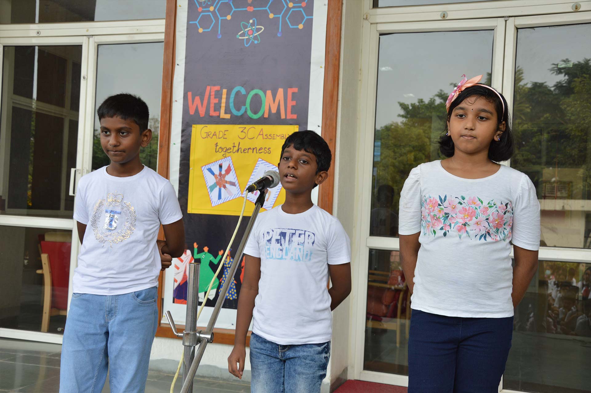 The students of 3C presented their class assembly on Togetherness. Quotes from famous personalities set the theme for the assembly. This was followed by a group dance which was choreographed to depict the importance of being together, while having a unique identity. Children updated the audience on the International, National, State news apart from informing them on Sports and Weather report.