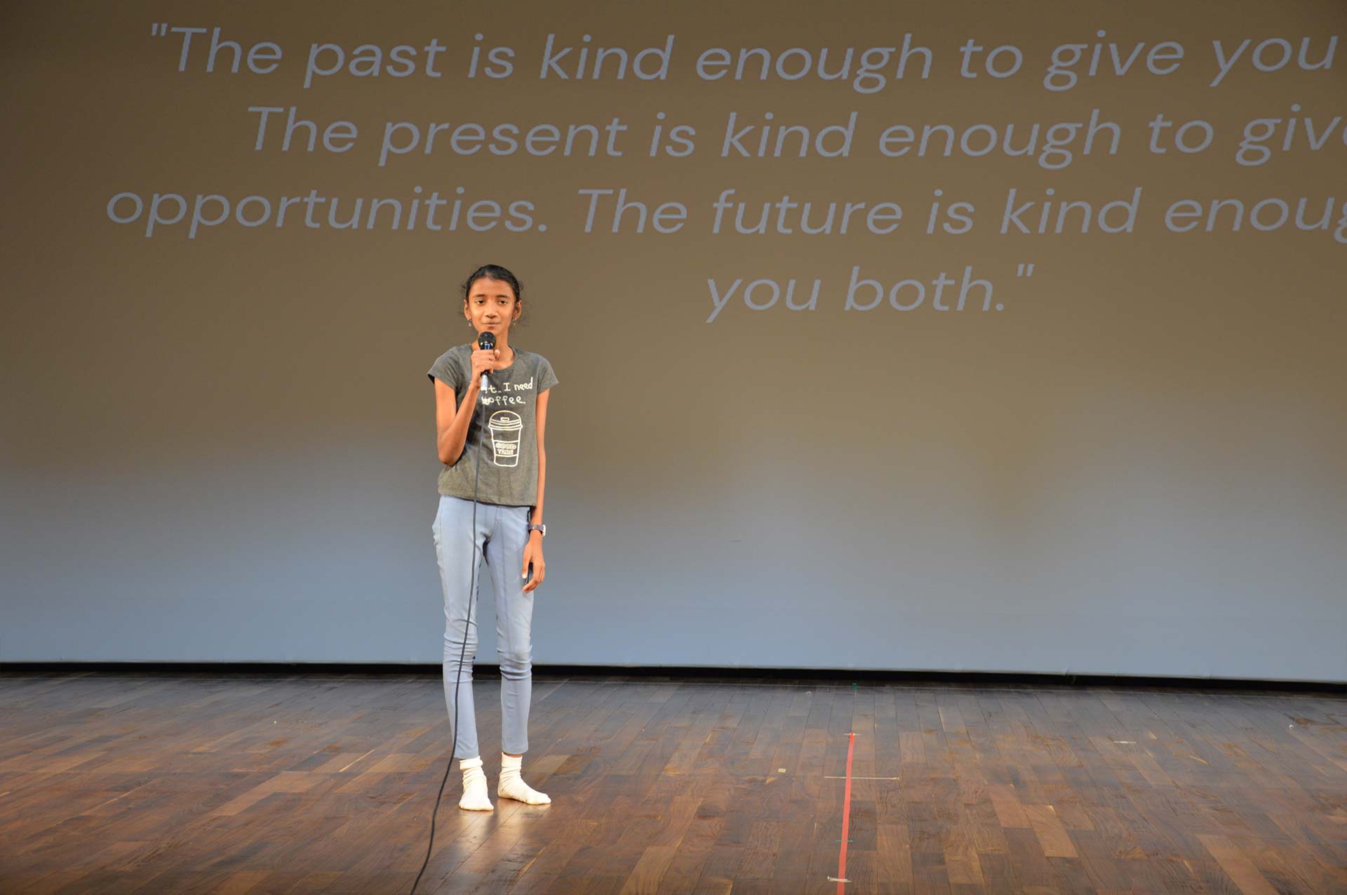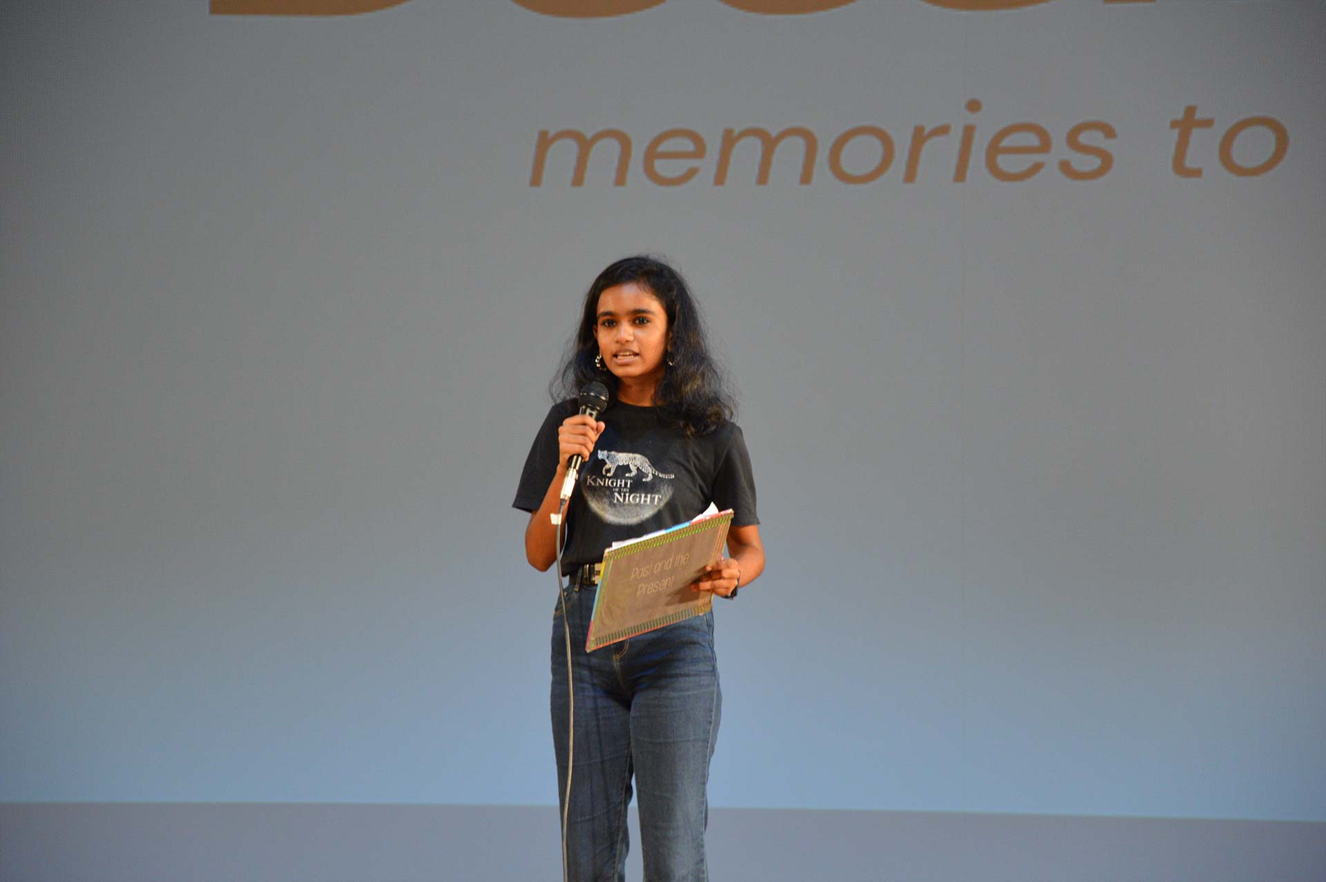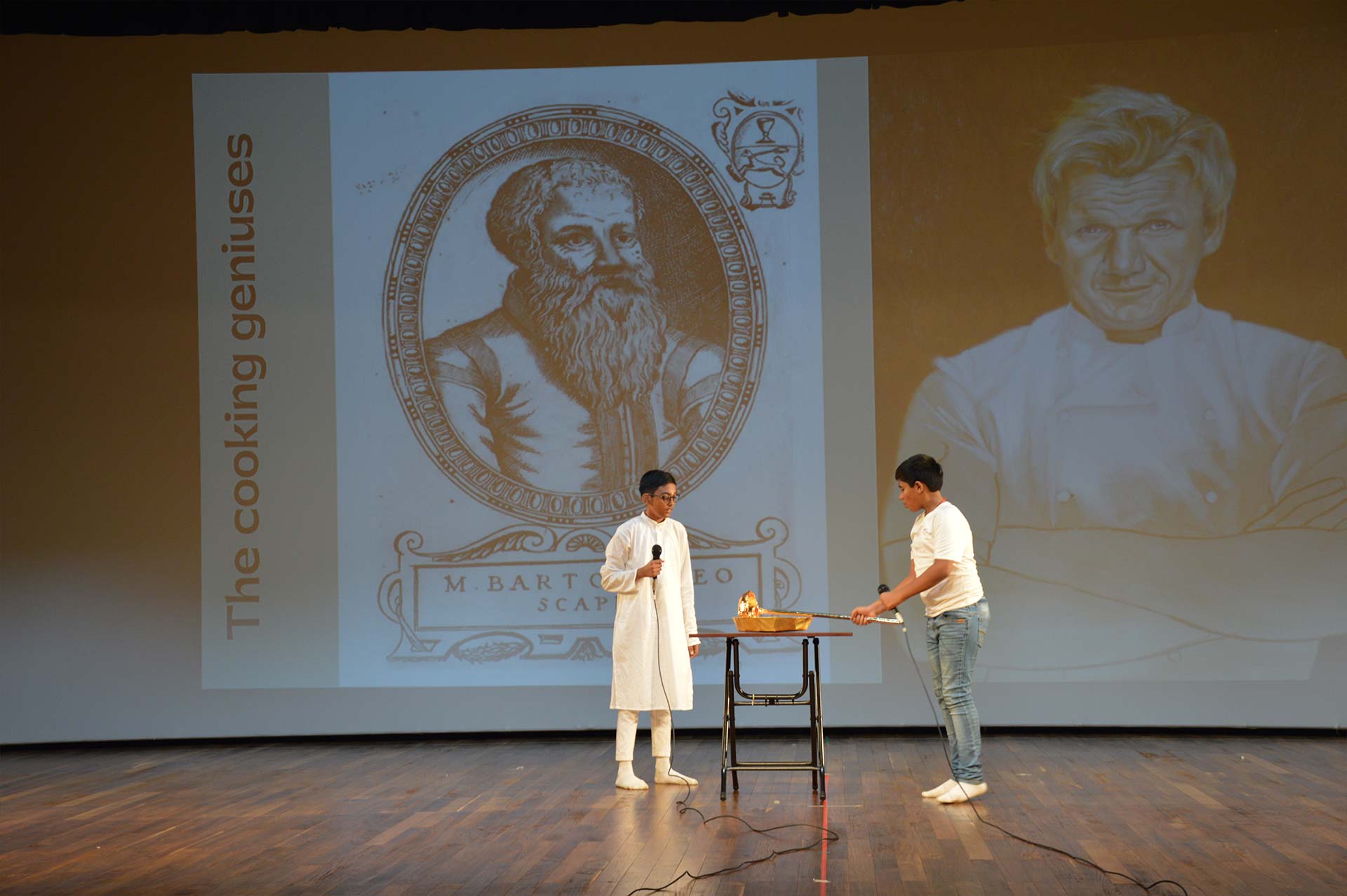 The students of 8C presented the theme, ‘Past vs Present,’ and began with the creation of time by a mad scientist. The narrative brought the audience on a trip through the ages, spanning diverse timelines. Students used their non-linear tale to highlight the failed assassination of Theodore Roosevelt, arrange a face-off between cooking prodigies Bartolomeo Scappi and Gordon Ramsey, and showcase the comedic genius of of Charlie Chaplin and Joey Tribbiani.