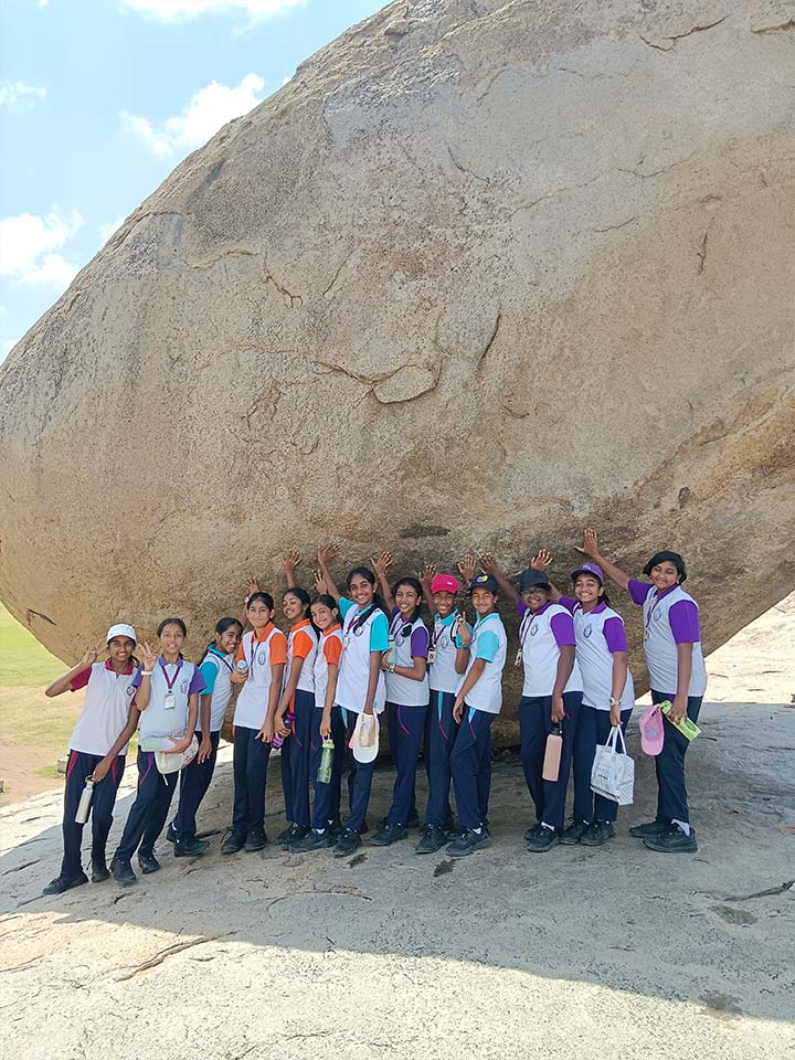 The visit began at the iconic Shore Temple, standing majestically along the Bay of Bengal. Students were fascinated to learn how this centuries-old structure has withstood the forces of nature and time. They then visited the Five Rathas, where each monument is carved from a single rock. The intricate carvings and varied architectural styles offered valuable insights into ancient craftsmanship. Another highlight was Krishna’s Butter Ball, a massive balancing boulder that amazed the students.