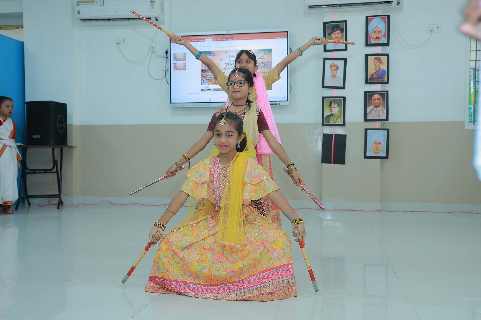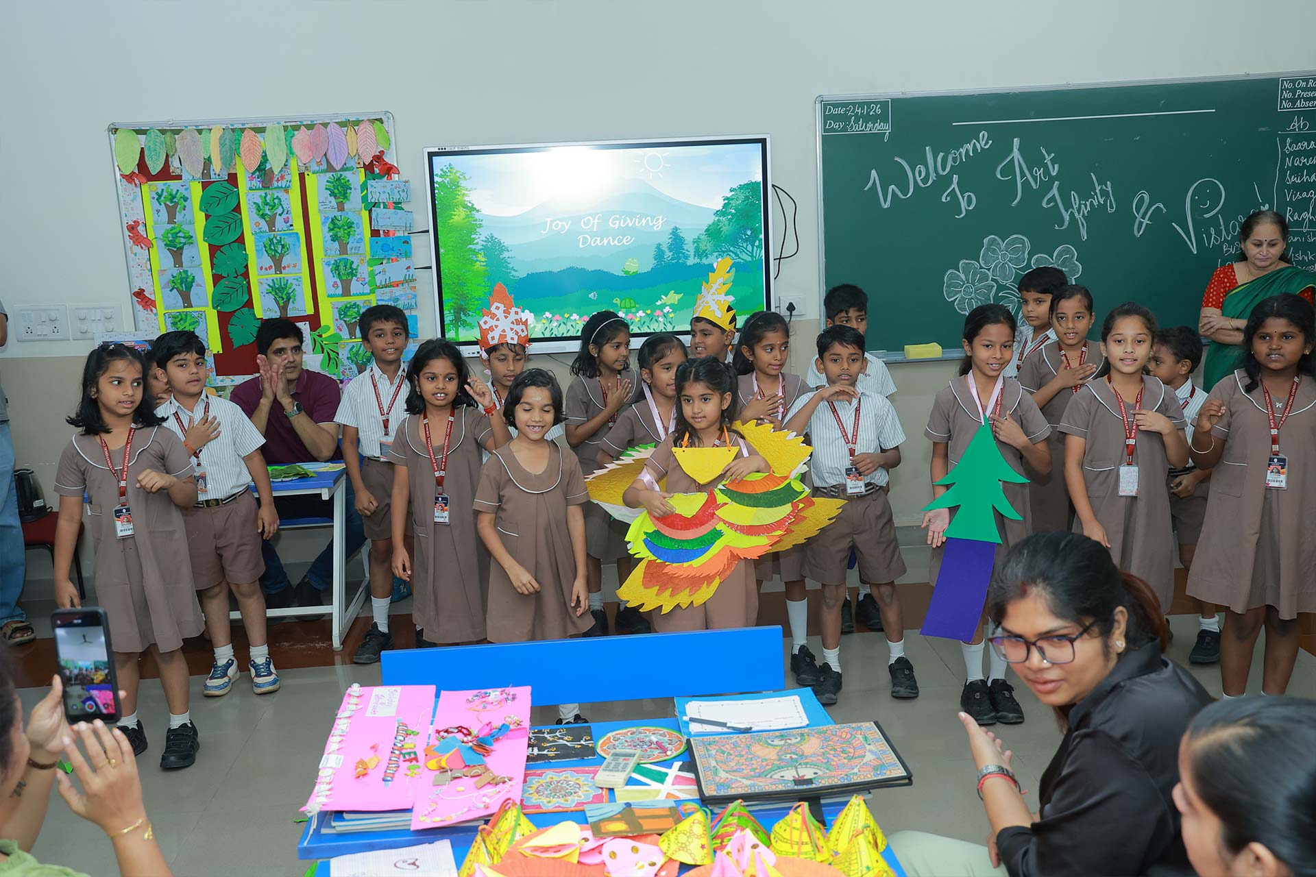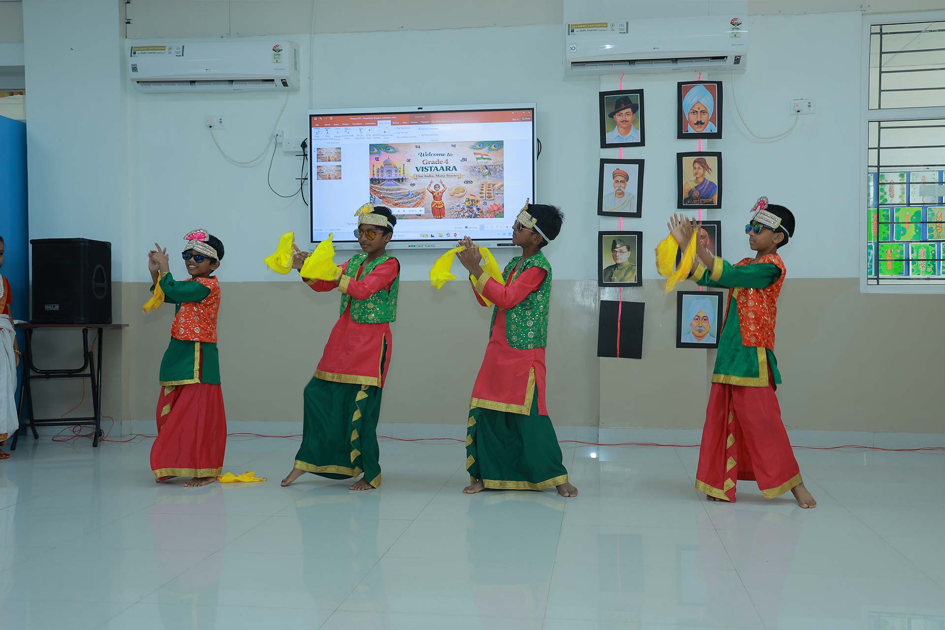 Grade 4 students from all sections collaborated seamlessly to present six thematic counters celebrating One India, Many Stories. Echoes of India saw students confidently explaining iconic monuments using symbolic passports. At Woven Wonders, students showcased regional fabrics and engaged parents in hands-on block printing. Motifs and Masterpieces highlighted traditional art forms, inviting parents to create Warli and Pichwai drawings. Soil to Sacrifice featured students speaking about diverse food grains and famous regional dishes, while also bringing alive stories of lesser-known Indian freedom fighters through enactments and interactions with parents. Games that Grew Generations revived traditional games with active parent participation, and Books Beyond Borders celebrated linguistic diversity as students presented parents with cute, handwritten thank-you notes in various Indian languages. A vibrant classical and folk dance performance beautifully reinforced India’s unity in diversity.