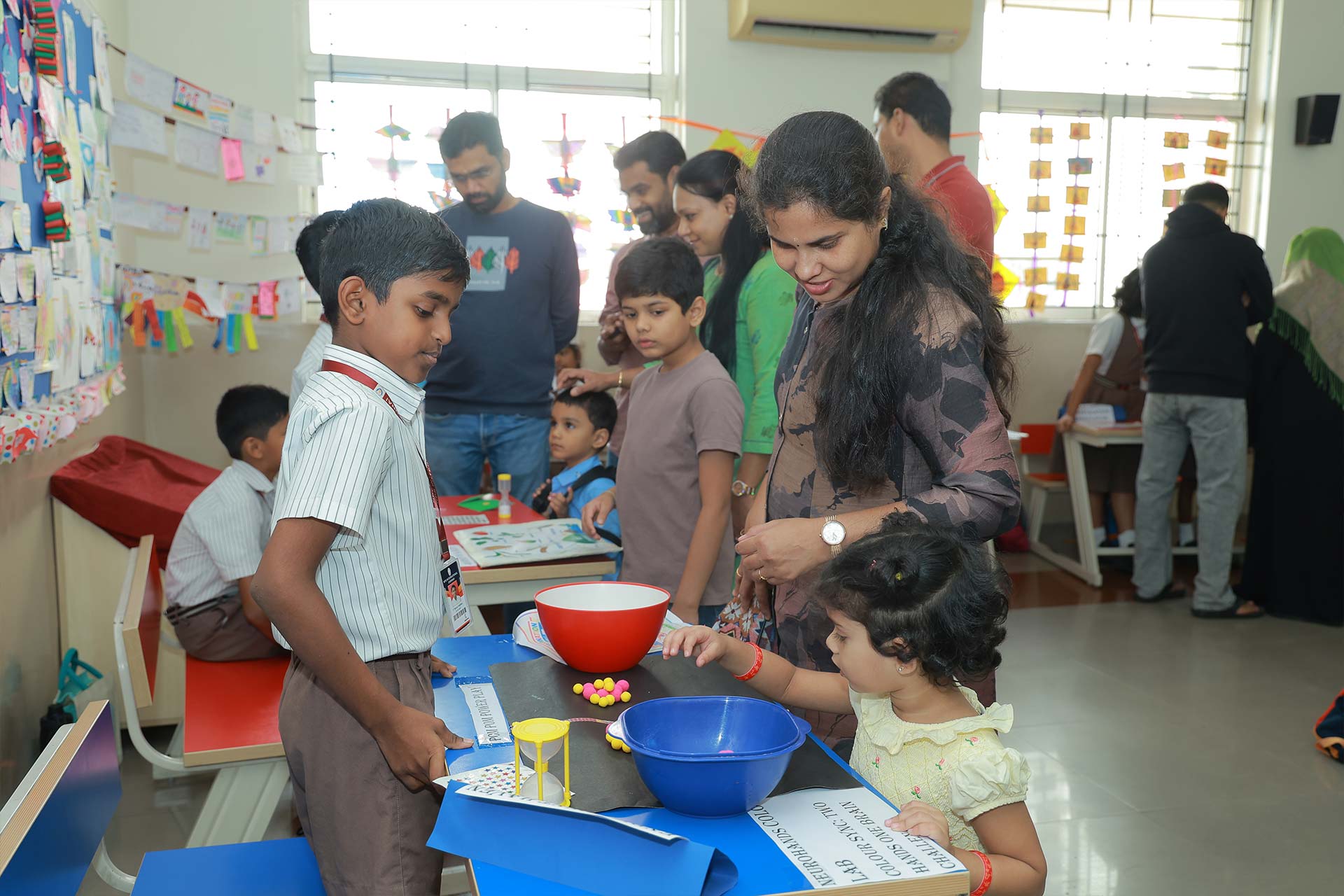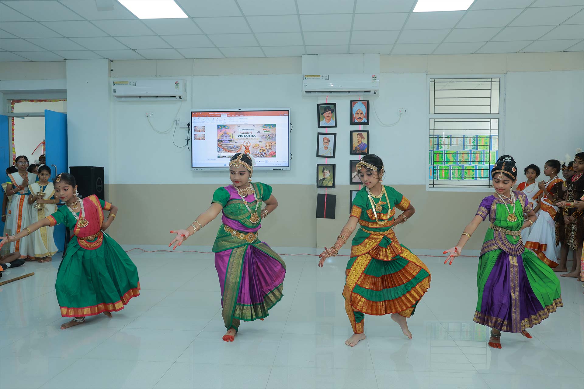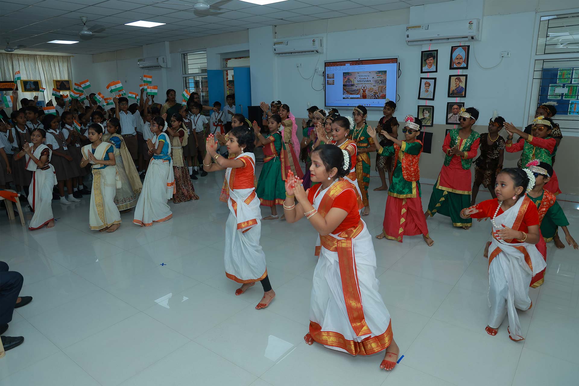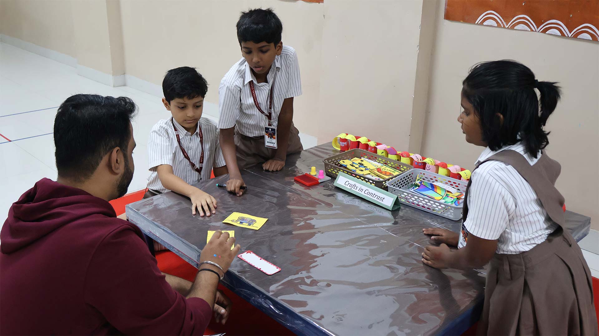 Grade 4 students from all sections collaborated seamlessly to present six thematic counters celebrating One India, Many Stories. Echoes of India saw students confidently explaining iconic monuments using symbolic passports. At Woven Wonders, students showcased regional fabrics and engaged parents in hands-on block printing. Motifs and Masterpieces highlighted traditional art forms, inviting parents to create Warli and Pichwai drawings. Soil to Sacrifice featured students speaking about diverse food grains and famous regional dishes, while also bringing alive stories of lesser-known Indian freedom fighters through enactments and interactions with parents. Games that Grew Generations revived traditional games with active parent participation, and Books Beyond Borders celebrated linguistic diversity as students presented parents with cute, handwritten thank-you notes in various Indian languages. A vibrant classical and folk dance performance beautifully reinforced India’s unity in diversity.