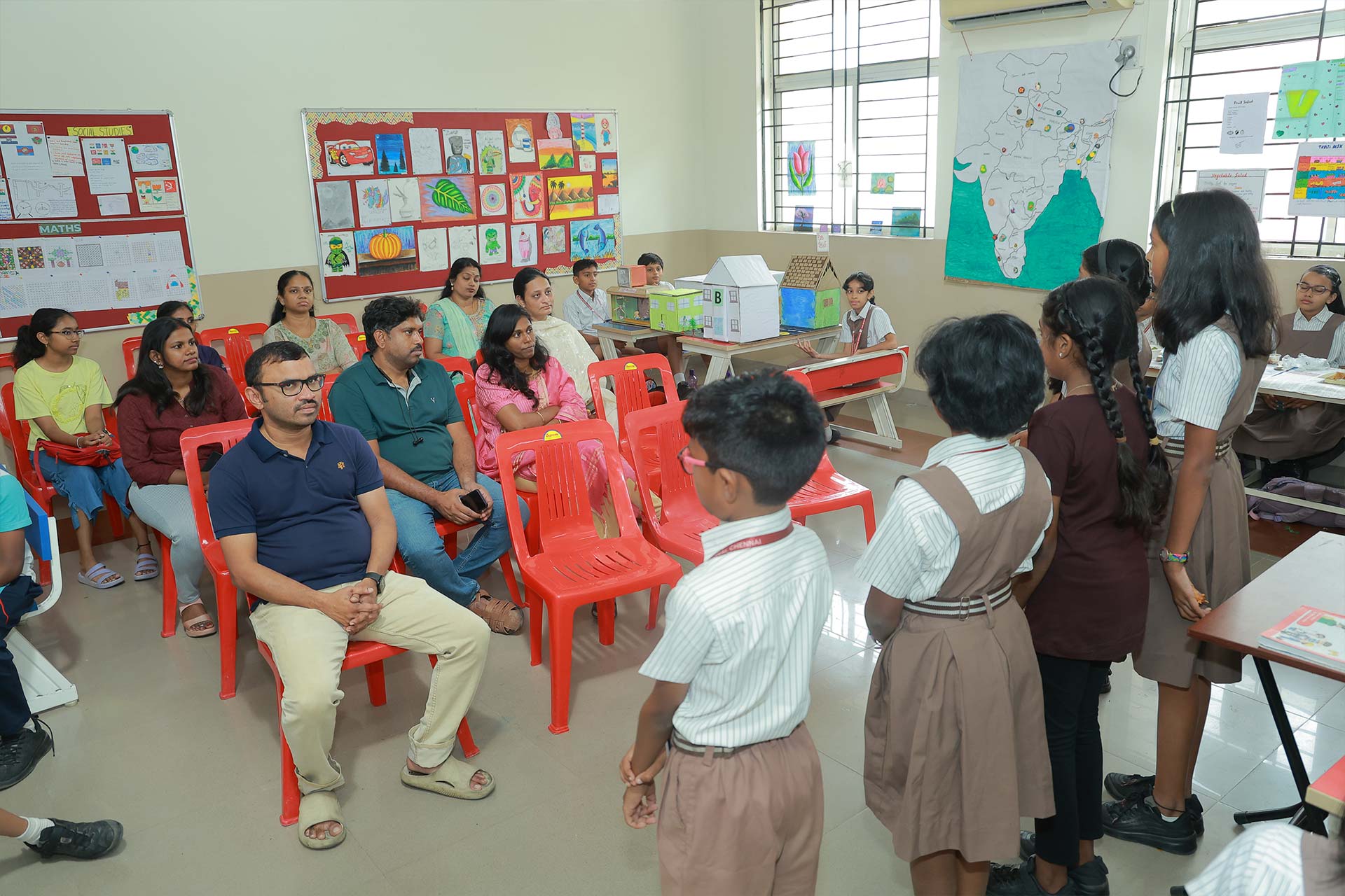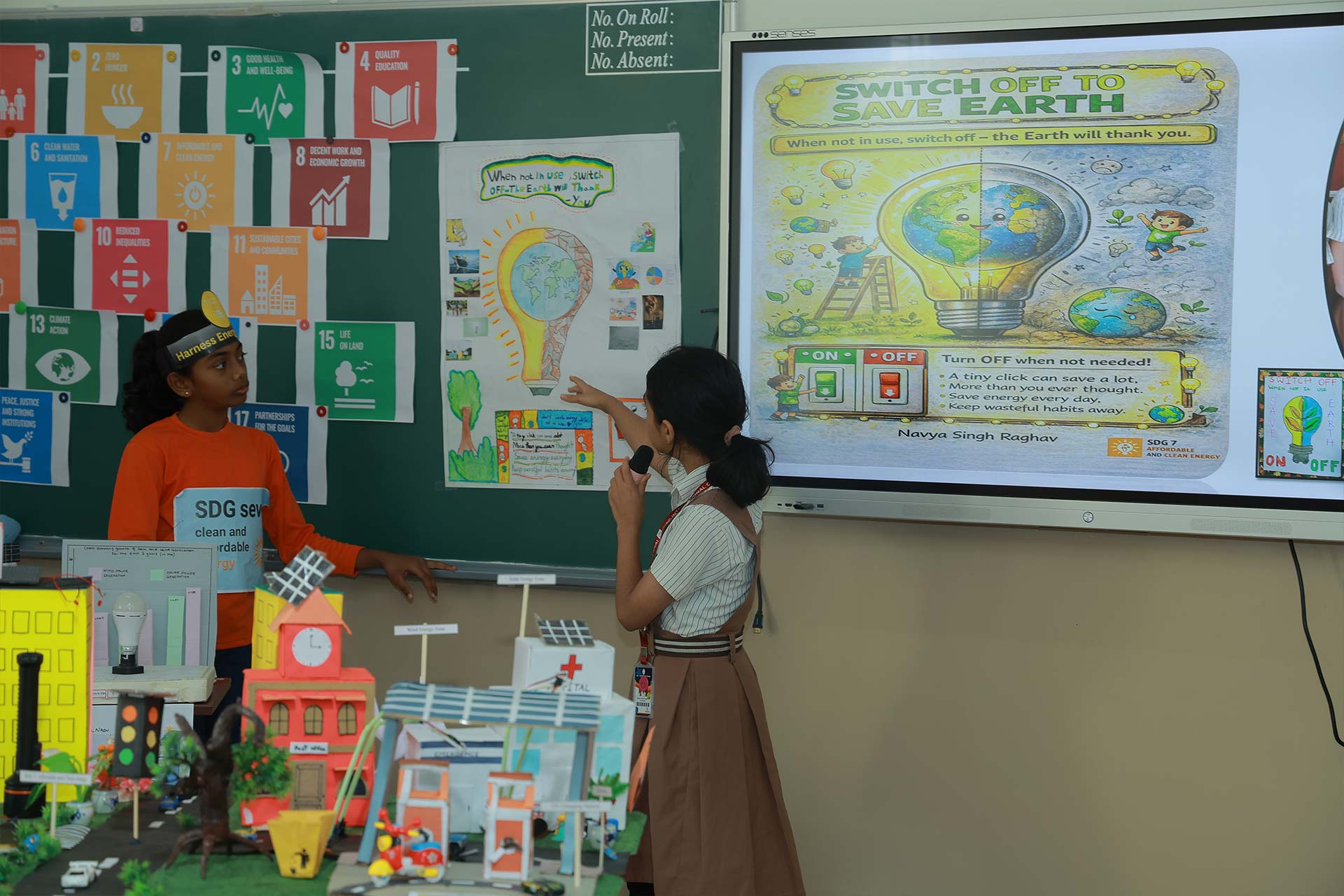 Grade 5 students presented the culmination of their maiden Project-Based Learning (PBL) experience at Vistaara, confidently sharing their learning journey and outcomes with parents. The projects were anchored in the UN Sustainable Development Goals, with each section exploring a distinct theme—Grade 5A examined Economy vs Ecology, focusing on the contribution of wetlands to sustainable living; Grade 5B addressed No Poverty and Zero Hunger; Grade 5C explored Responsible Consumption; and Grade 5D focused on Affordable and Clean Energy.