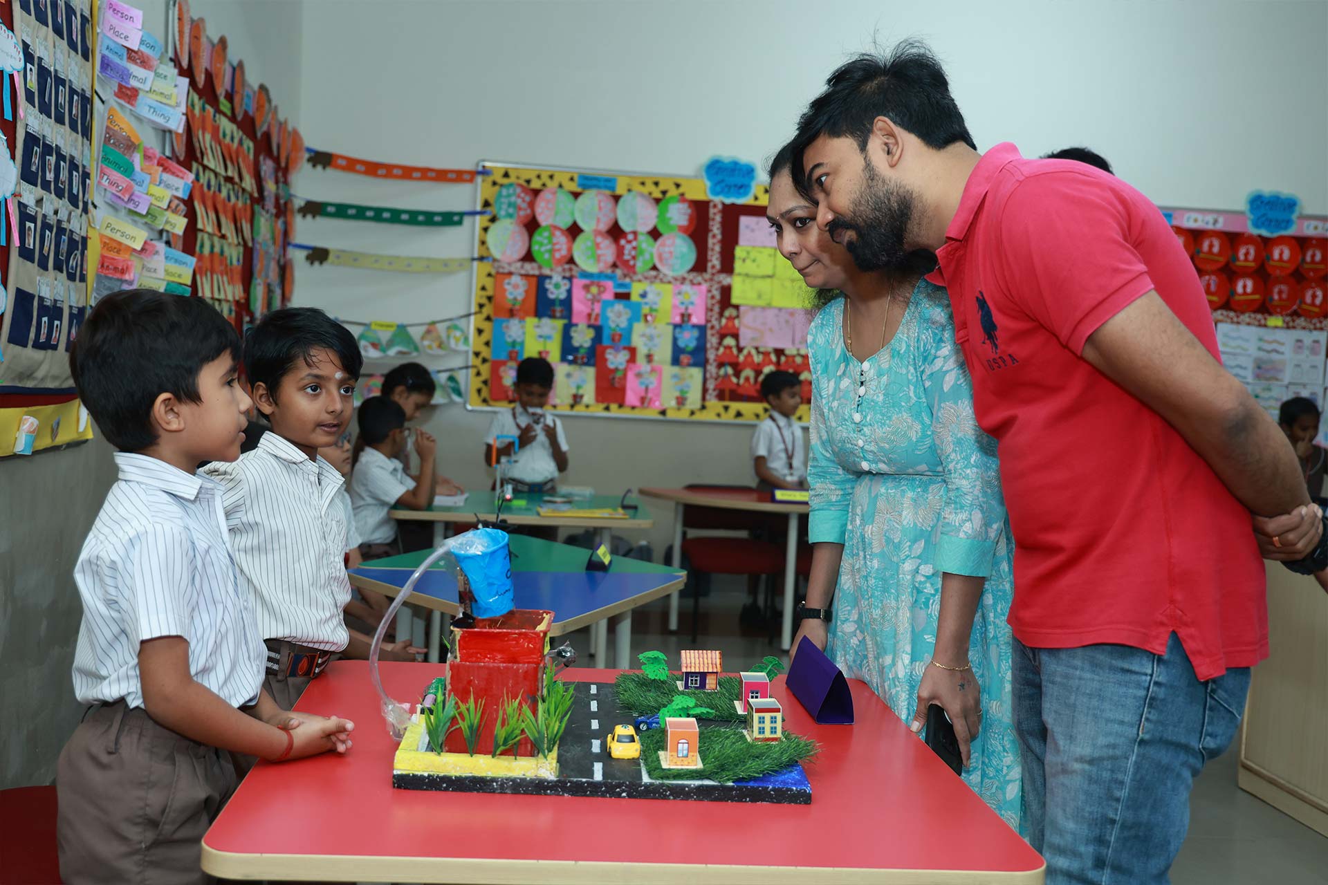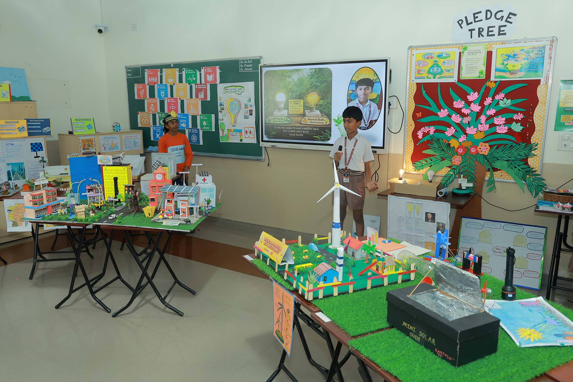 Through Project-Based Learning, students engaged in extended inquiry by addressing real-world problems. They presented their project journey, which began with understanding the Sustainable Development Goals, followed by group formation, surveys, research, model-making, data analysis, awareness creation, and brainstorming viable solutions. Students shared their learning through visual displays, live demonstrations, skits, and interactive explanations, clearly articulating the challenges faced, decisions made, and the impact of their solutions.