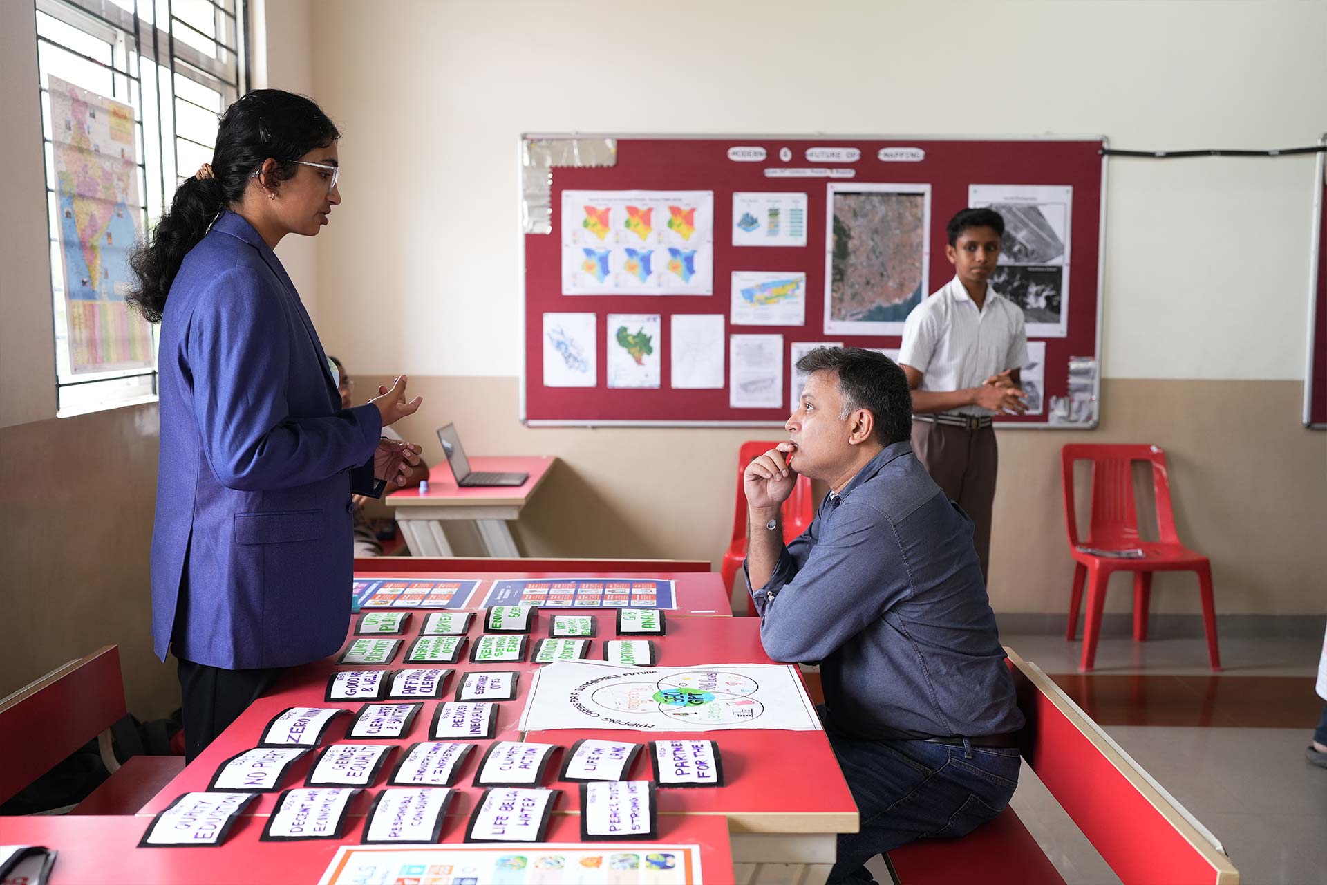 In History and Civics, students explored climate change through historical perspectives such as Krishnadevaraya’s court and the findings from Keezhadi, highlighting sustainable practices and environmental responsibility. Geography presentations focused on mapping through time, AI, GIS, and career opportunities, with hands-on activities using scientific instruments that captured parents’ interest.